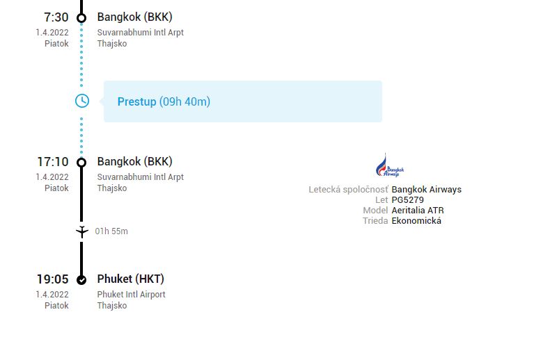 Dôležité! Celá tvoja cesta na Phuket musí byť rezervovaná na jednej letenke. Pri využití tejto alternatívy nemôžeš letenku Bangkok Airways rezervovať samostatne. Všetko musí byť na jednom itinerári. Najlepšie to urobíš prostredníctvom cestovnej kancelárie – čiže cez pelikánske akciové kalendáre alebo našim letenkovým špecialistom pošleš osobitnú požiadavku.
