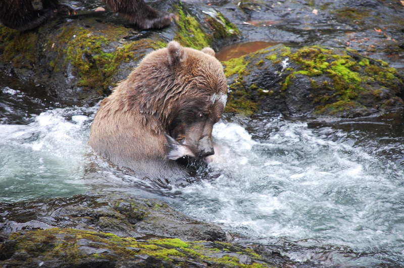 Čupiac potichu sme sledovali tú nevídanú nádheru pred sebou. „To je ako National Geographic, foť to!“, radovali sme sa pri pohľade na medvede, ktoré sa začali vrhať do rieky a loviť lososy. Obrovská medvedica dohliadala na svoje roztomilé medvieďatá, učila ich loviť a občas im vyskakujúcu rybu sama chytila.