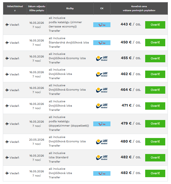 - leteckú dopravu v turistickej triede vrátane táx a príplatkov