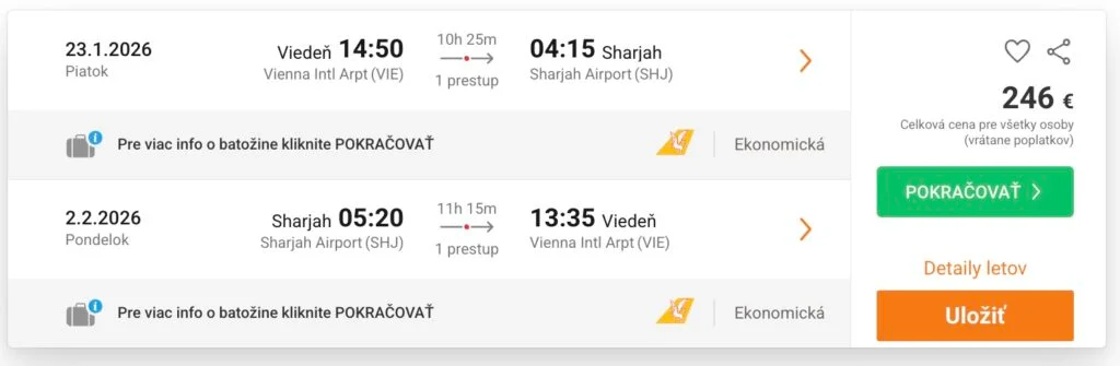 Let z Viedne do Sharjah trvá približne 6 hodín. Na cestu si nezabudnite pribaliť vlastný notebook či ipad, monitory na každom sedadle nenájdete. Letecká spoločnosť má však k dispozícii vlastný „entertainment service“. Po vzlietnutí stačí prepnúť zariadenie do letového režimu, vybrať wifi SkyTime a vybrať si film, seriál či hudbu z ponuky.