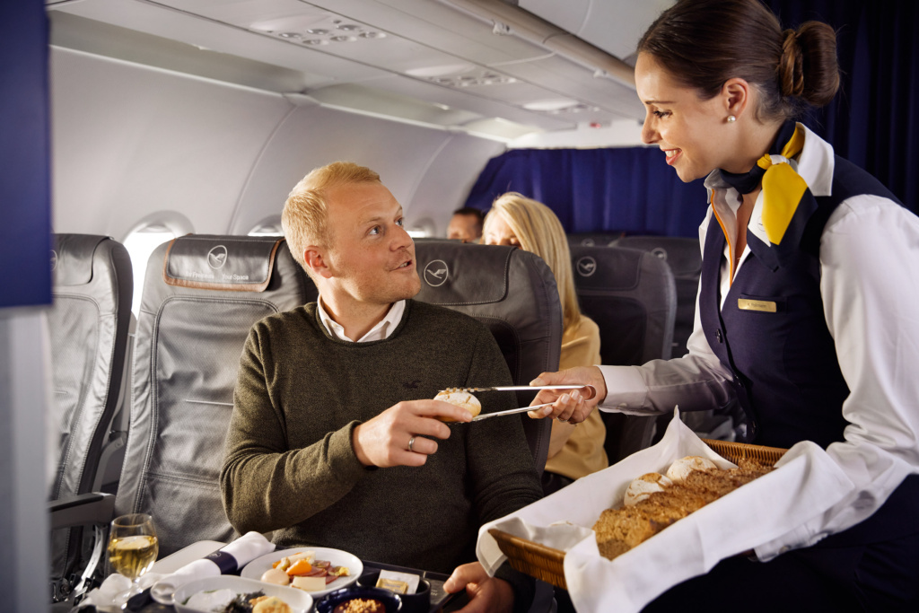 - Servis začne ihneď po nástupe s „welcome drinkom“. Približne 20 minút po odlete vám letušky ponúknu hygienické horúce utierky s nápojom podľa vlastného výberu a orechy k prvému drinku. Jedlo pozostáva zo 4 chodov – predjedlo, polievka, hlavné jedlo, dezert. Na ďalšie jedlo sa môžete tešiť pred príletom – obed/ večera alebo raňajky podľa času príletu.