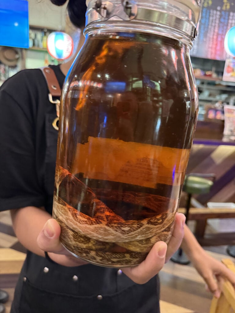 Možno to znie prekvapivo, ale Okinawčania nie sú abstinenti. Varia si vlastné pivo a pripravujú aj tradičny alkoholický nápoj s hadom vo fľaši, Habushu, s ktorým to ale nesmieš preháňať. Hadí nápoj vraj pôsobí ako afrodiziakum. Mňa tento nápoj skôr uspáva. Tak už zostáva len nájsť náš hotel a naladiť sa na japonský čas, teda zaspať.