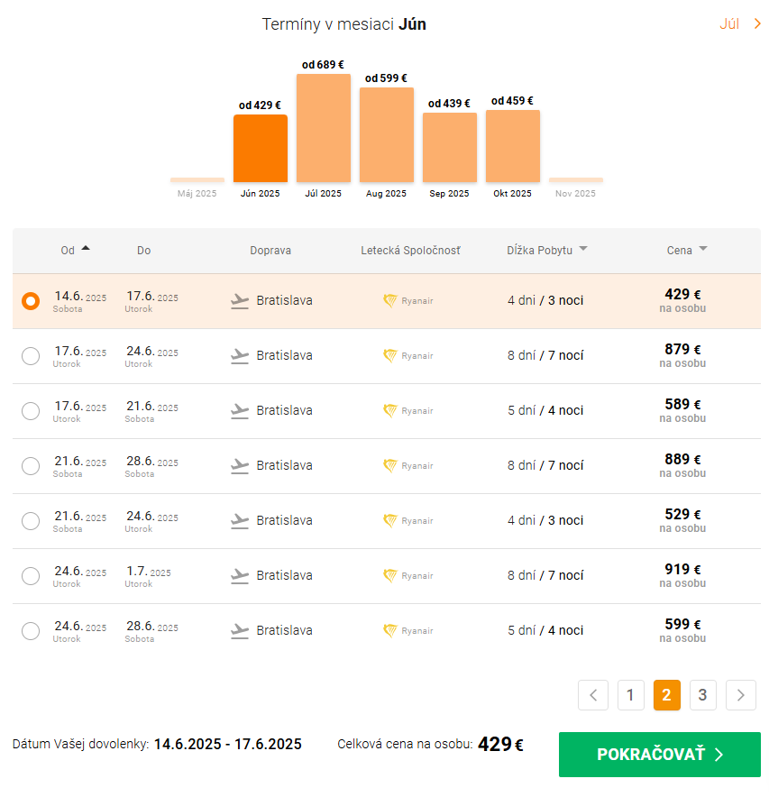 • priamy let z Bratislavy, 2x týždenne (vždy v utorok a v sobotu) – oproti ostatným cestovným kanceláriám, Pelikán ponúka aj kratšie zájazdy na 4 dni.