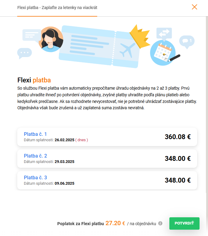 Pelikán automaticky rozdelí finálnu sumu objednávky na tretiny (prípadne polovicu, v závislosti od blízkosti termínu odletu) a počas rezervácie letenky/dovolenky uhradíš len prvú časť tejto objednávky. Napríklad, ak je aktuálne do odletu minimálne 68 dní a viac, systém rozdelí sumu na dve platby. Ak je do odletu minimálne 99 dní a viac, suma je rozdelená na tri platby.